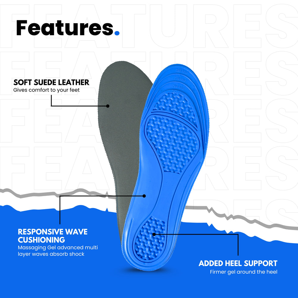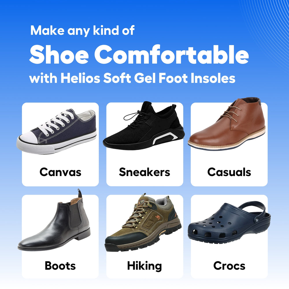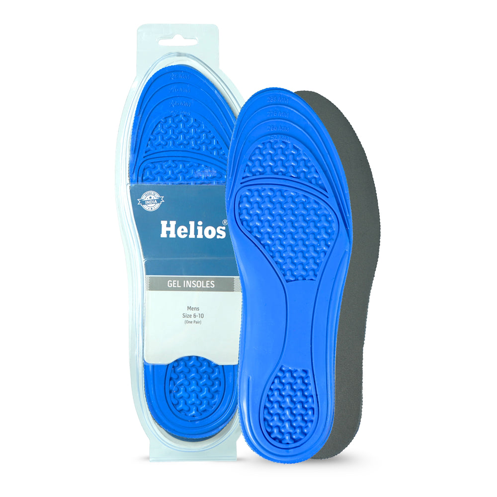 Helios Gel Insole is made up of high-quality soft gel which provides extreme cushioning and comfort to your feet. It provides comfort from heel to toe. Men's Size 6-10 marked on the insole. Trim to fit for a custom fit. These Gel Insoles are designed to eliminate pain-causing vibrations and provide comfort to the feet. These gel-filled insoles are engineered to provide acupressure treatment on 14 vital reflex points on your foot that connects to all the body parts.