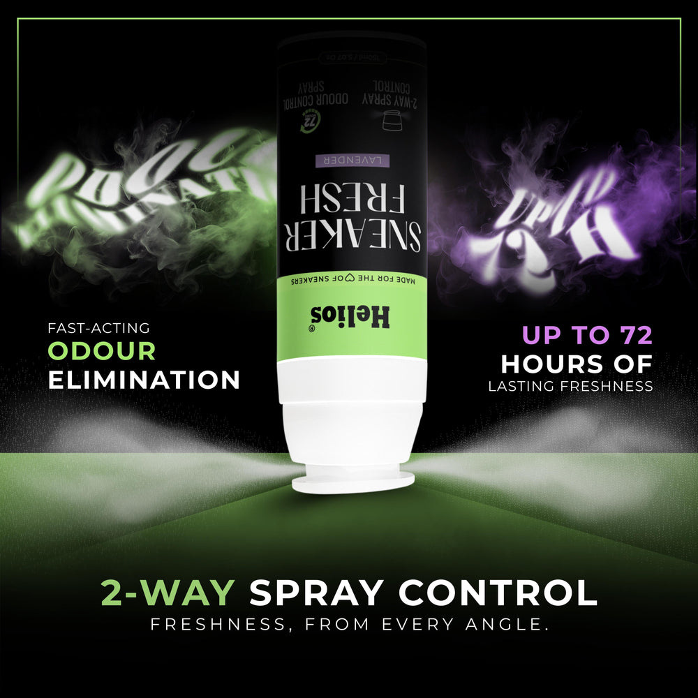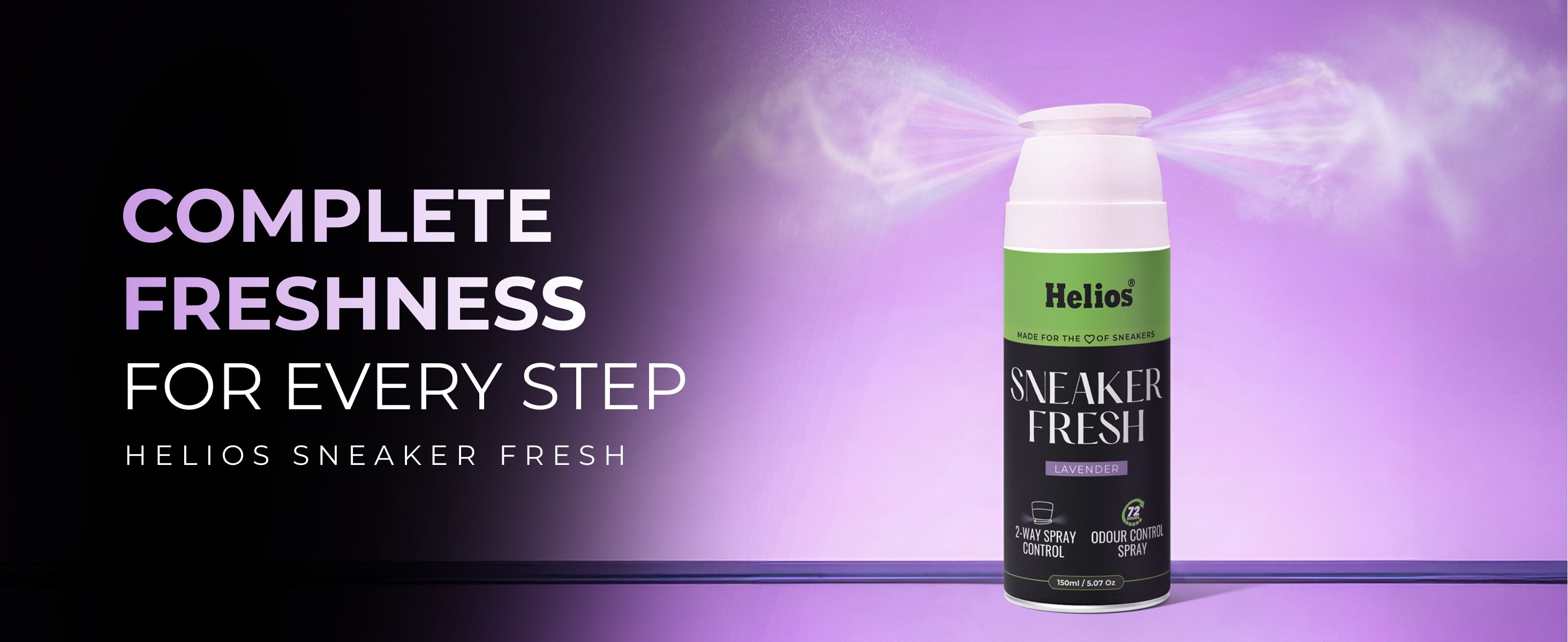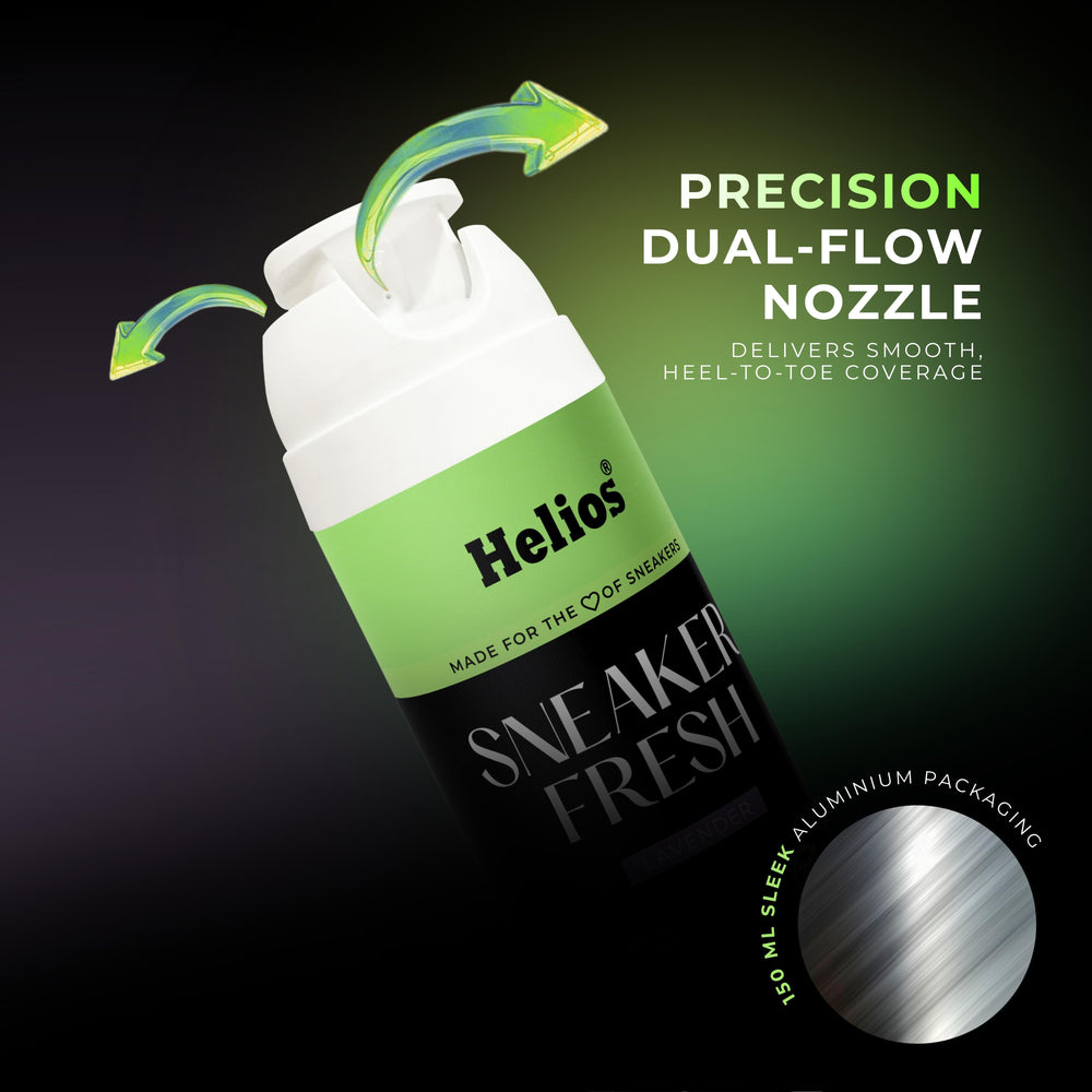Helios Sneaker Fresh is a next-gen sneaker freshener designed specifically for shoe interiors. Powered by a precision dual-flow nozzle, it sprays in two directions at once, delivering even, heel-to-toe coverage where odour actually lives.