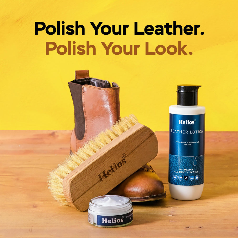 Helios Leather Lotion cleans and nourishes the leather and maintain its natural softness. Especially recommended for leather goods and upholstery. For an example use a clean cloth to apply the lotion. leave to dry. Buff it with a brush for better results. Can be used on any leather product like a leather bag, wallet, belt and much more.