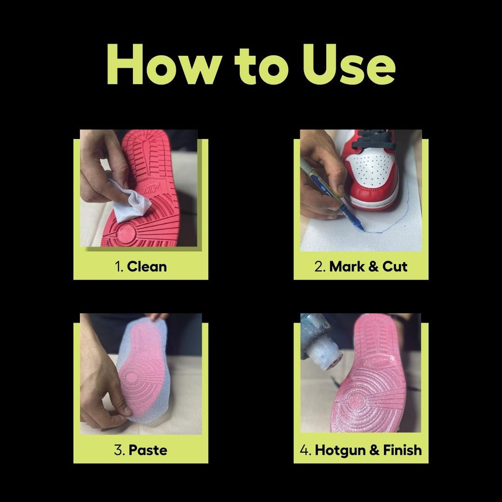 1.Begin by thoroughly cleaning the shoe's sole using the acetone wipes { included in the box}. Ensure it dries completely.