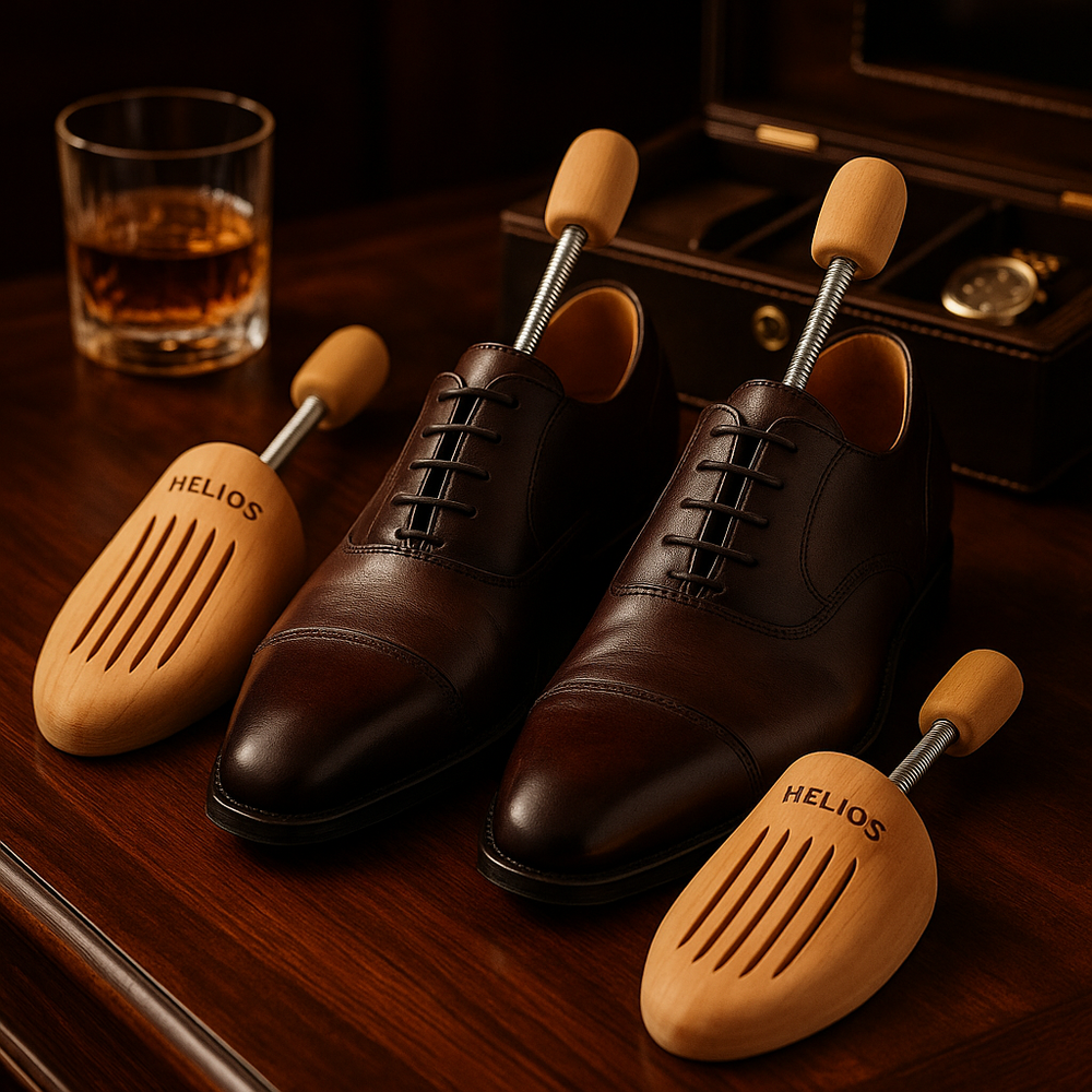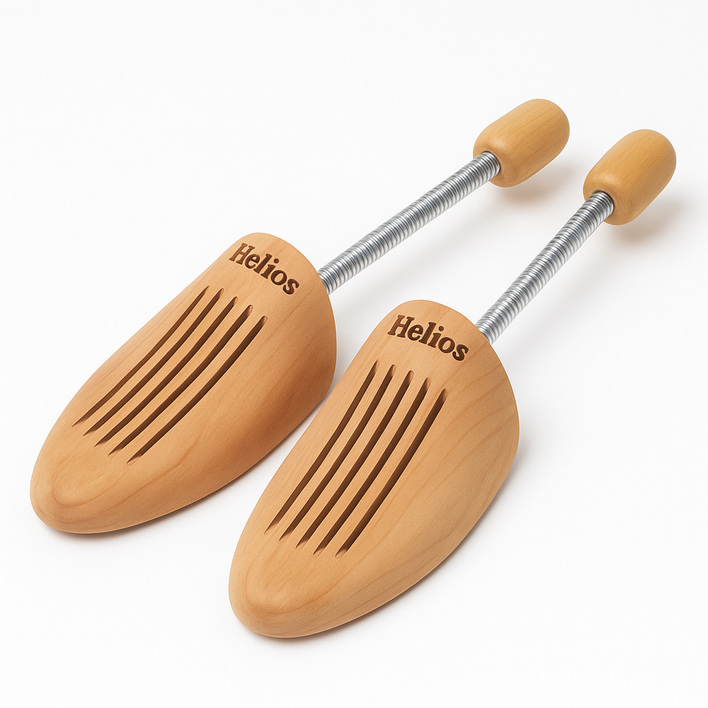 The Helios Shoe Trees are crafted from durable, smooth-finished Lotus wood — designed to retain the natural shape of your leather shoes and sneakers. With a spring-loaded design that gently stretches your footwear from heel to toe, these shoe trees help prevent creases, maintain structure, and keep your shoes looking box-fresh, wear after wear.