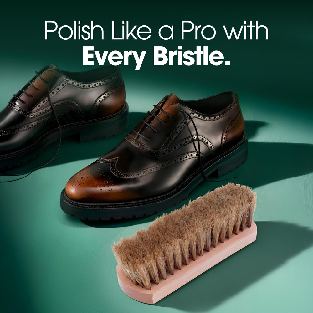 After cleaning your shoes with a shoe cream, you need a polishing brush to remove the excess cream from the leather upper. After a few minutes, the leather is saturated and offers a semi-gloss shine. If you rub the bristles upon the leather, you create warmth. This in turn bonds the small wax particles in the polish to the leather upper and gives your shoes an inimitable shine.