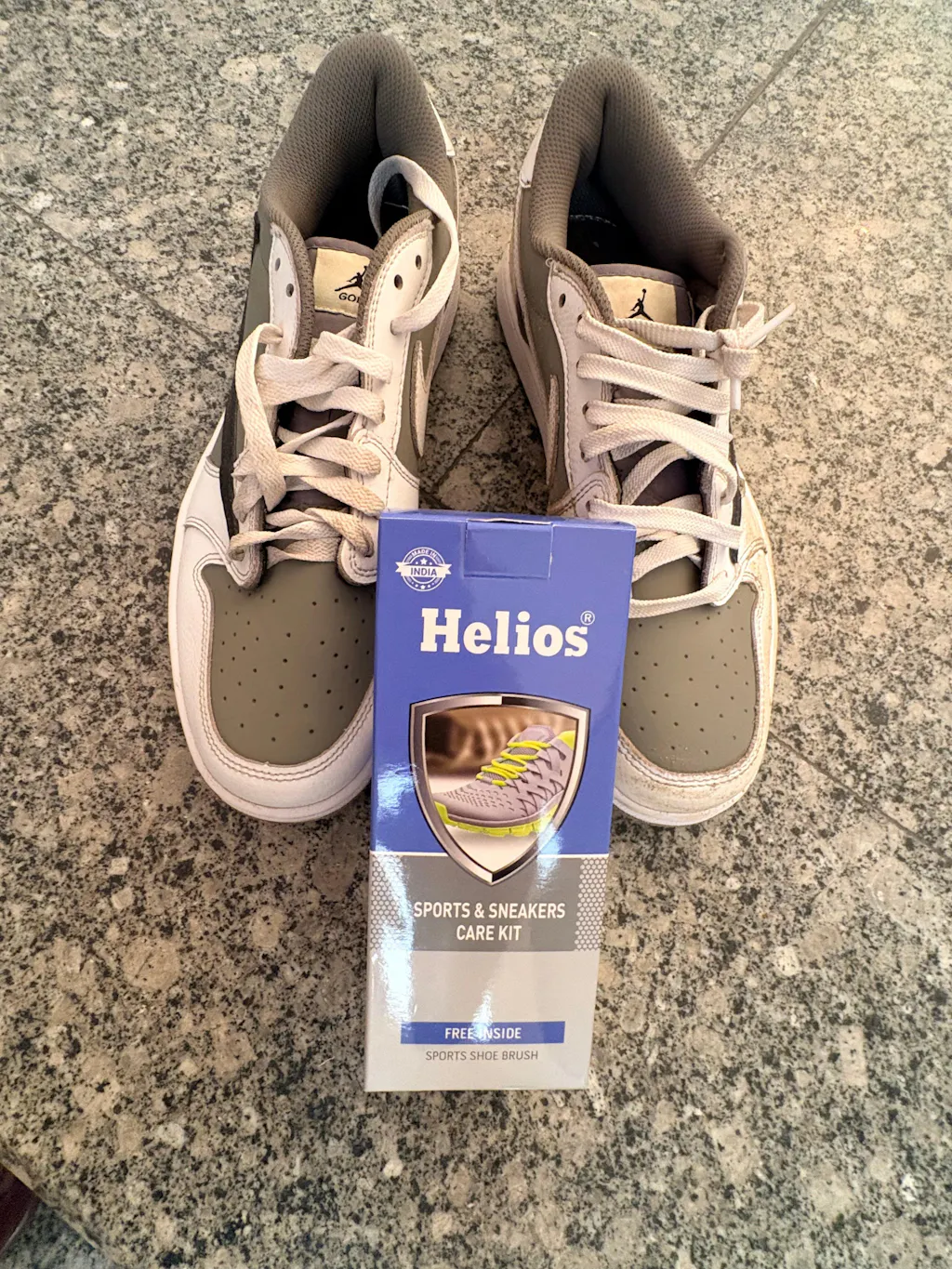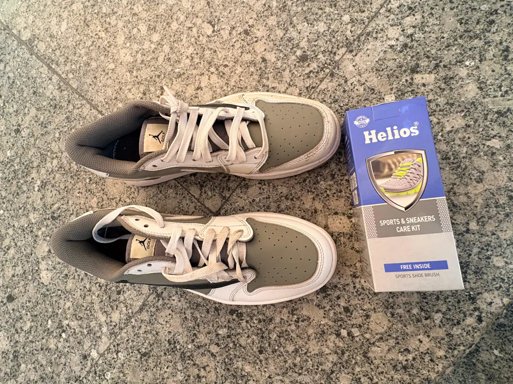 My mesh running sneakers were grey with embedded dust. Applied foam, worked the Helios brush in circular motions — mesh cleaned to near-original white. All-in-one claim is accurate.